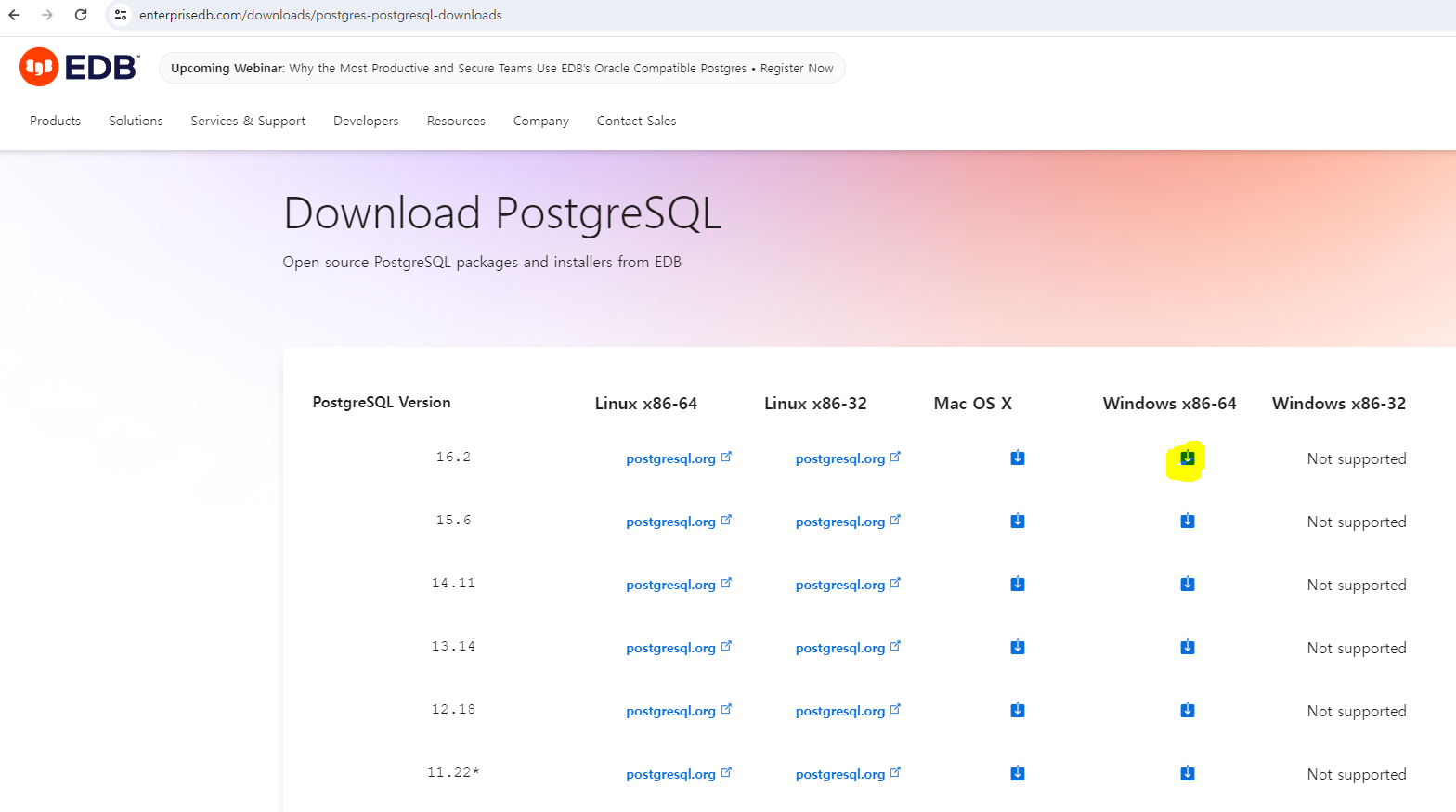 1. PostgreSQL 다운로드 사이트로 접속 https://www.postgresql.org/download/windows/ PostgreSQL: Windows installers Windows installers Interactive installer by EDB Download the installer certified by EDB for all supported PostgreSQL versions. Note! This installer is hosted by EDB and not on the PostgreSQL community servers. If you have issues with the website it's hoste www.postgresql.org https://www.enterpr..