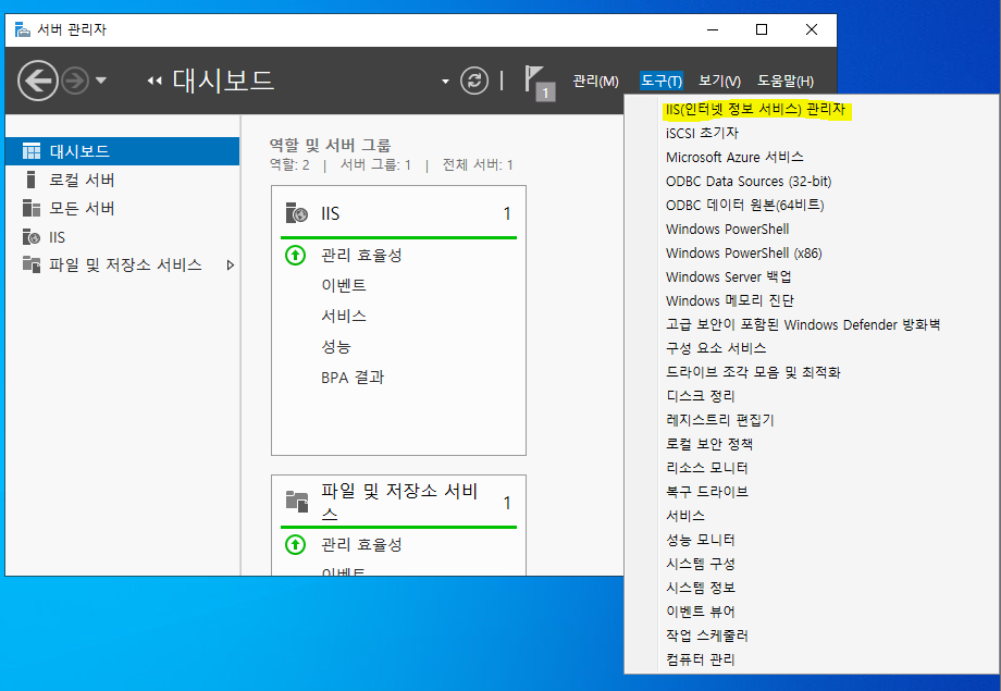 도구 > IIS(인터넷 정보 서비스)관리자 클릭