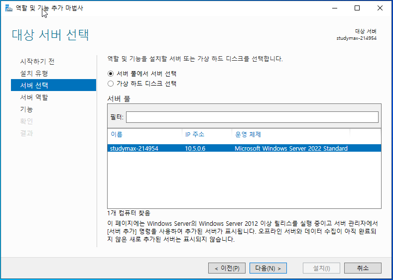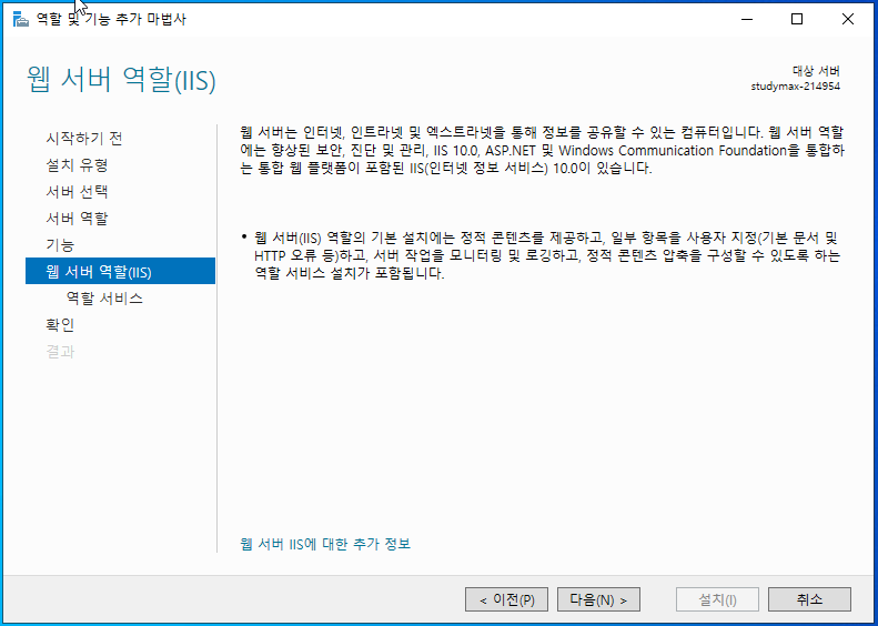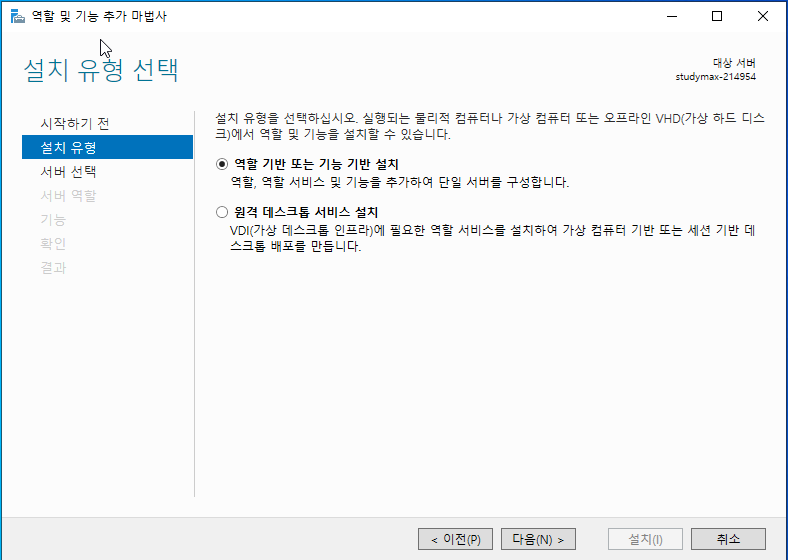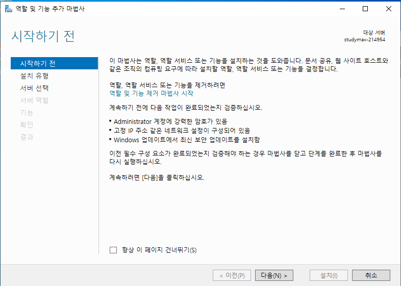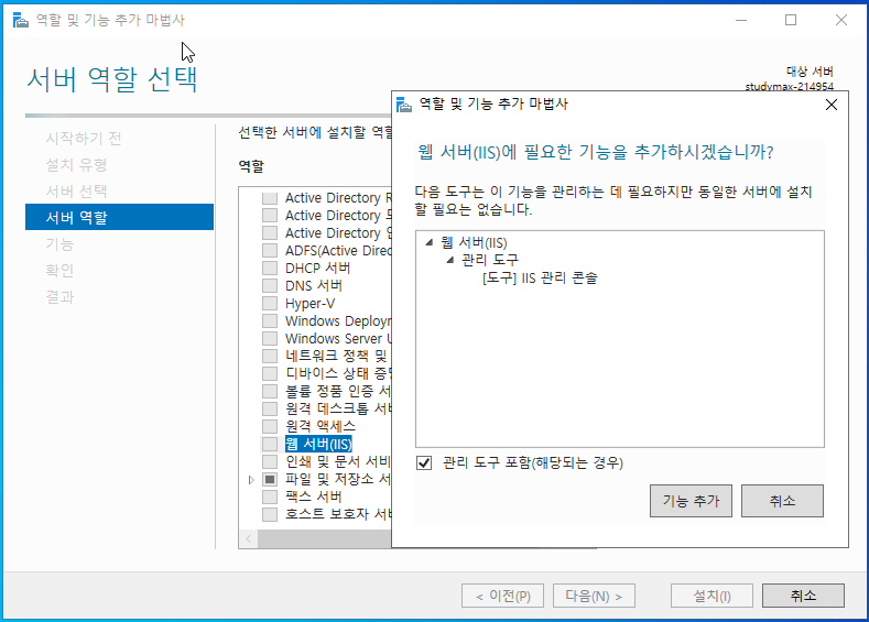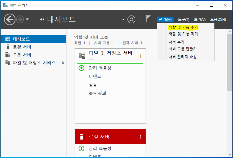 서버관리자 대시보드에서 관리 > 역할 및 기능 추가를 클릭해줍니다.