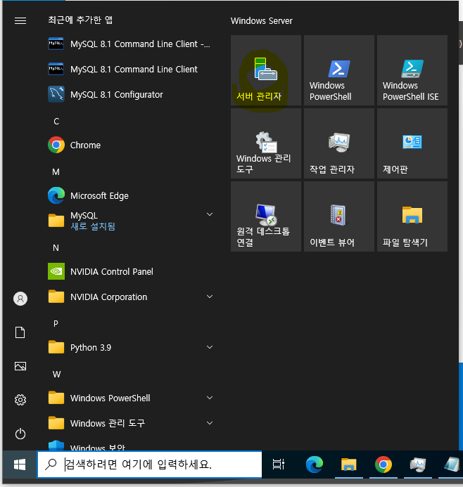 왼쪽 윈도우 시작 버튼을 누르면 서버관리자가 나옵니다.