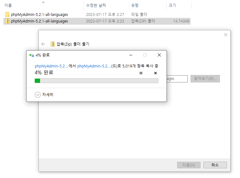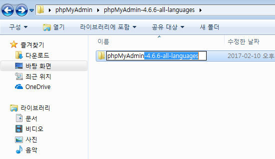 이때 디렉토리명을 뒤에 버젼등등을 다 지우고 phpMyAdmin 으로 바꿔준다.