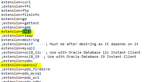 php.ini 파일을 열고 intl 과 openssl 부분을 주석 제거하고 웹서버를 restart 해준다.