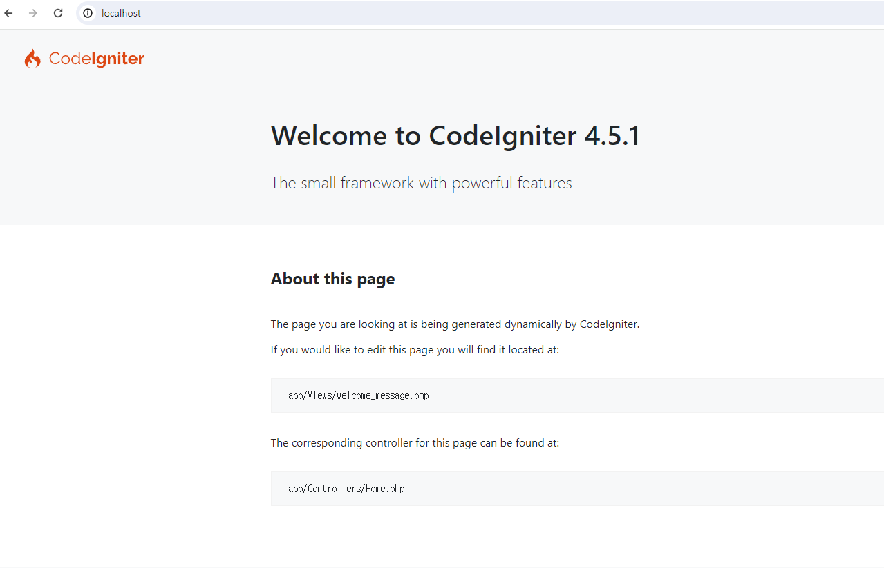 그러면 아래와 같이 CI4 기본 화면이 뜬다.