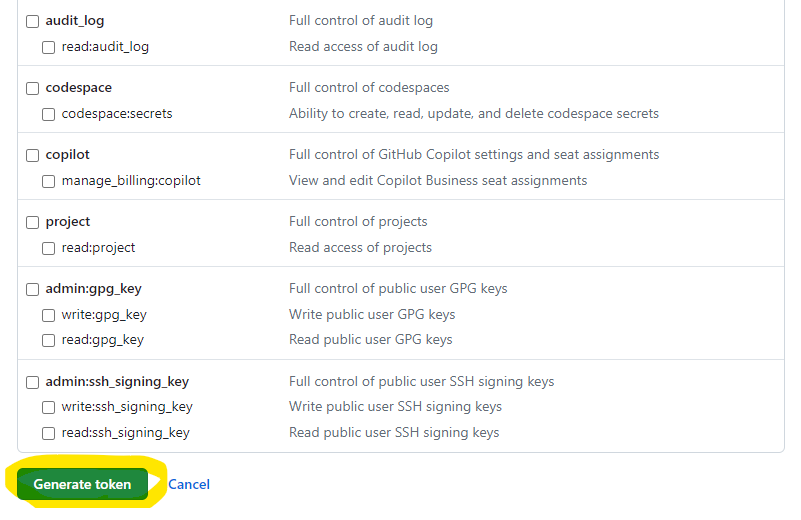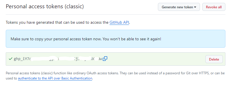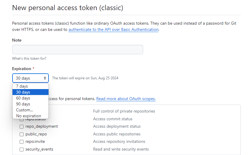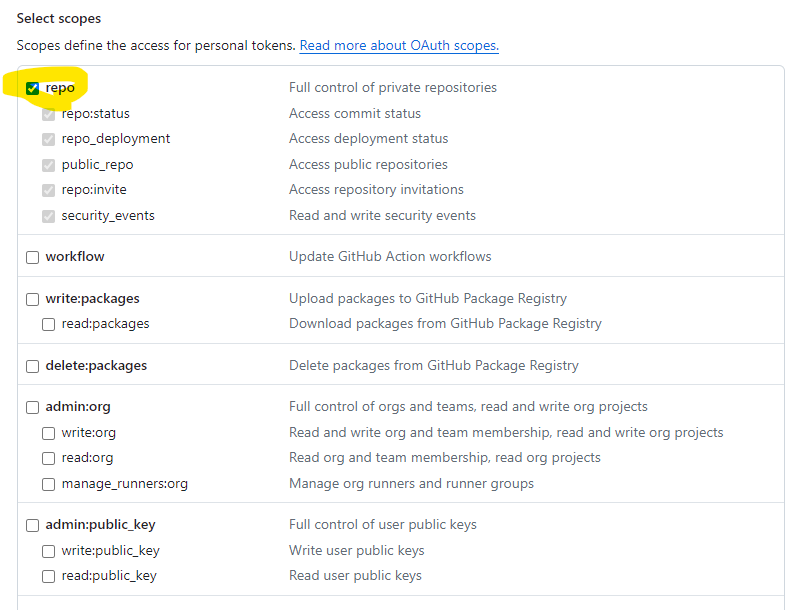 발급하려는 토큰에 접근할 수 있는 범위를 지정할 수 있는데 repo는 기본으로 설정을 한다.