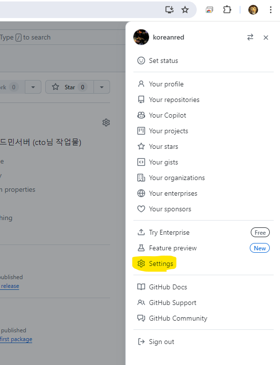 github에 가서 로그인을 한후에 오른쪽 자기 썸네일을 클릭을 하면 메뉴가 나온다.